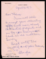 Letter from Gladys P. Graham to Thelma Gorham. Graham turning Gorham down regarding an invite she was sent. April 7, 1953. -