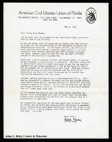 Letter from Alicia Novey to fellow ACLU member. Novey writing about current issues in the Florida Congress regarding criminal justice reform. Also includes an invitation and map flyer for a fundraising party for the ACLU. May 6, 1975. -