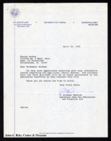 Letter from J. Michael Patrick to Thelma Gorham. Patrick thanking Gorham for a letter of recommendation she wrote. April 28, 1986