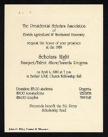Invitation to "Scholars Night" from the Presidential Scholars Association of Florida Agricultural & Mechanical University. April 6, 1989 -