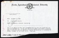Letter from Jim Hawkins to the Journalism Faculty at FAMU. Hawkins reminding faculty members of the due date for merit pay considerations. November 9, 1984 -
