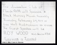 A copy of a flyer advertising an assembly held by the FAMU Journalism Club at which Roy Wood, News Director of the National Black Network will speak. -