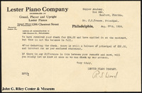 A letter and accompanying envelope from R. S. Wood of the Lester Piano Company to J. N. Crooms, in which Wood discusses a discrepancy in a bill. -