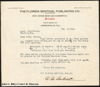A letter from W. W. Andrews, president of the Florida Sentinel Publishing Co., to J. N. Crooms, discussing the publication of copies of the minutes of the State Teachers Association. -