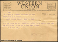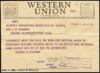 A Western Union telegram from George Engram to J. N. Crooms concerning a meeting of the Bethune-Volusia Beach Board of Directors. -